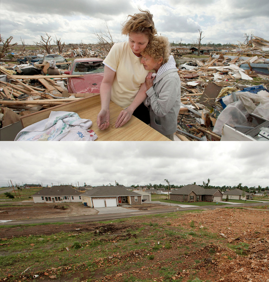 ジョプリンを襲った竜巻では、負傷者は少なくとも823人に上り、行方不明者は約1500人とみられている。この竜巻は、規模を示す「改良藤田(EF)スケール」で最も高い5を記録。風速は時速320キロ以上に達した。